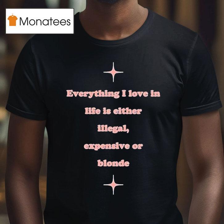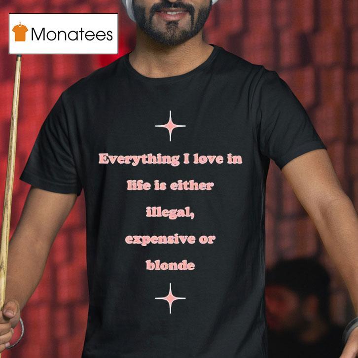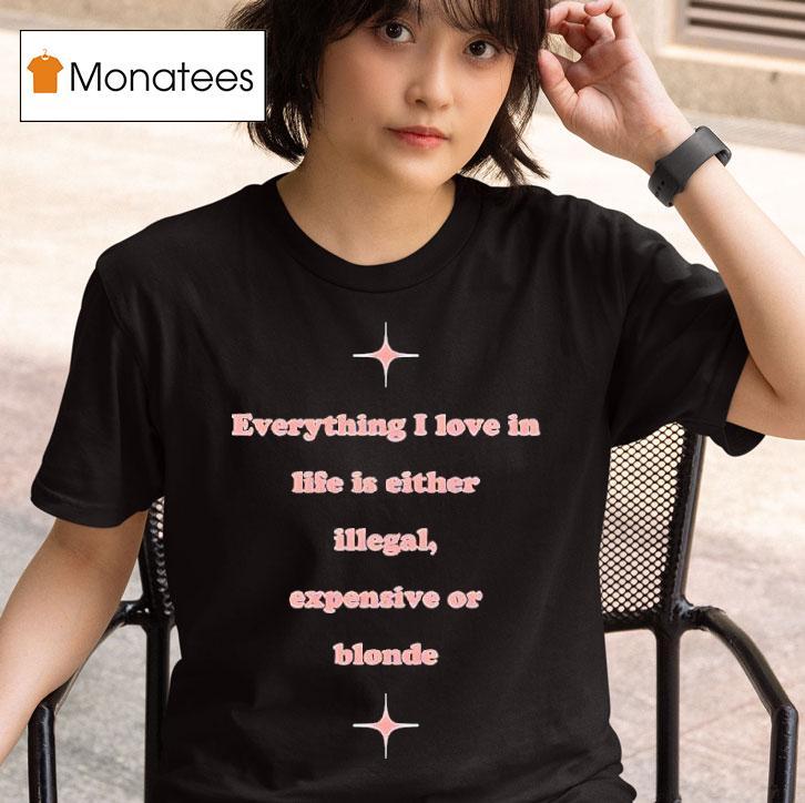 The perfect blank canvas with Everything I Love In Life Is Either Illegal Expensive Or Blonde Shirt, as I walked down the bustling city streets, my eyes were drawn to a bold statement on a stranger’s shirt. “Everything I Love In Life Is Either Illegal, Expensive, or Blonde.” And as I chuckled, I couldn’t help but relate to those words on a personal level.