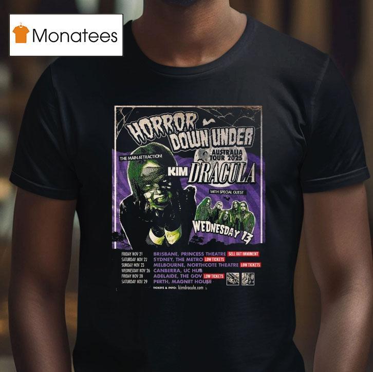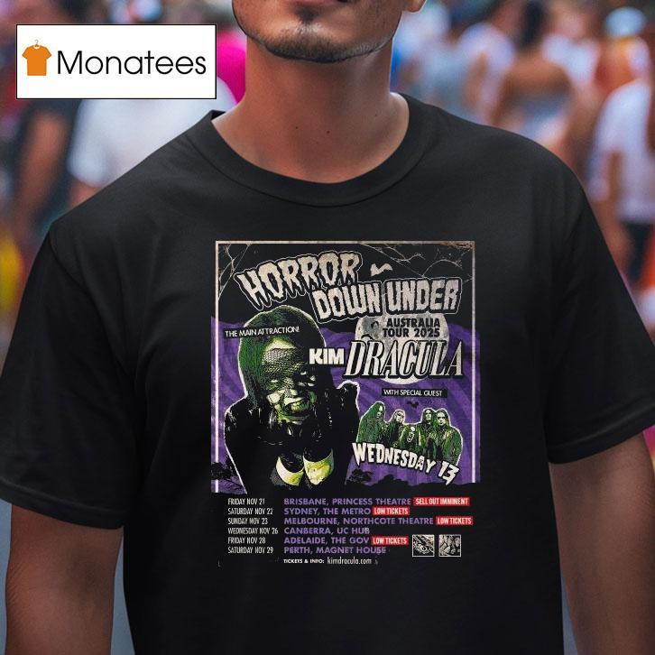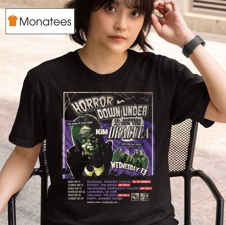 Wearable confidence booster with Horror Down Under Australia Tour 2025 Kim Dracula Wednesday 13 Shirt, get ready to experience the ultimate horror tour down under as we venture into the dark and mysterious corners of Australia in 2025. With special appearances by iconic horror figures Kim Dracula and Wednesday 13, you don’t want to miss this spine-chilling adventure. Don’t forget to grab your limited edition shirt!