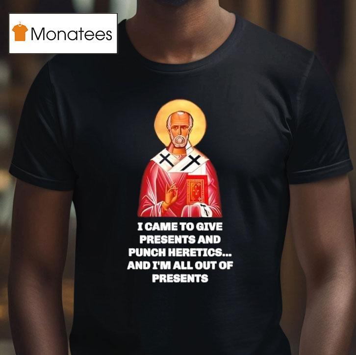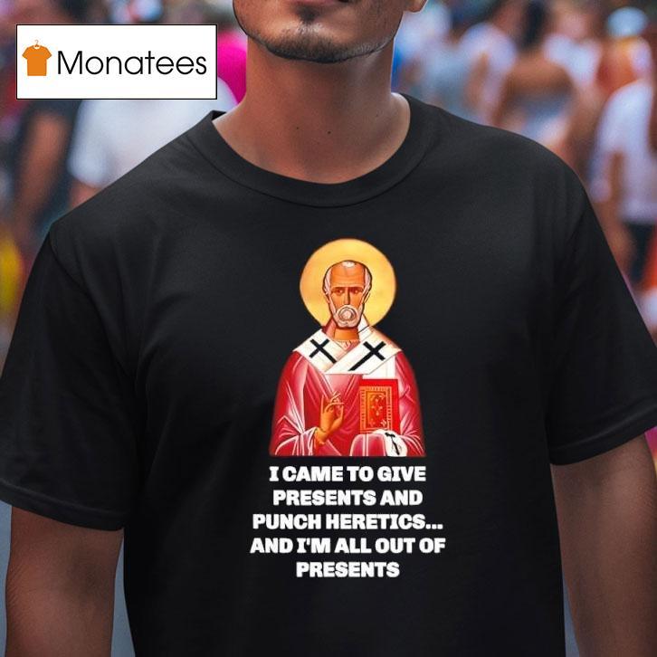 Simple sophistication, all day with I Came To Give Presents And Punch Heretics Saint Nicholas Shirt, welcome to the festive season where Saint Nicholas reigns supreme! As he travels to spread joy and cheer, he also brings with him his signature “I Came To Give Presents And Punch Heretics” Saint Nicholas shirt, a must-have for all believers. Let’s celebrate with style and humor this year!