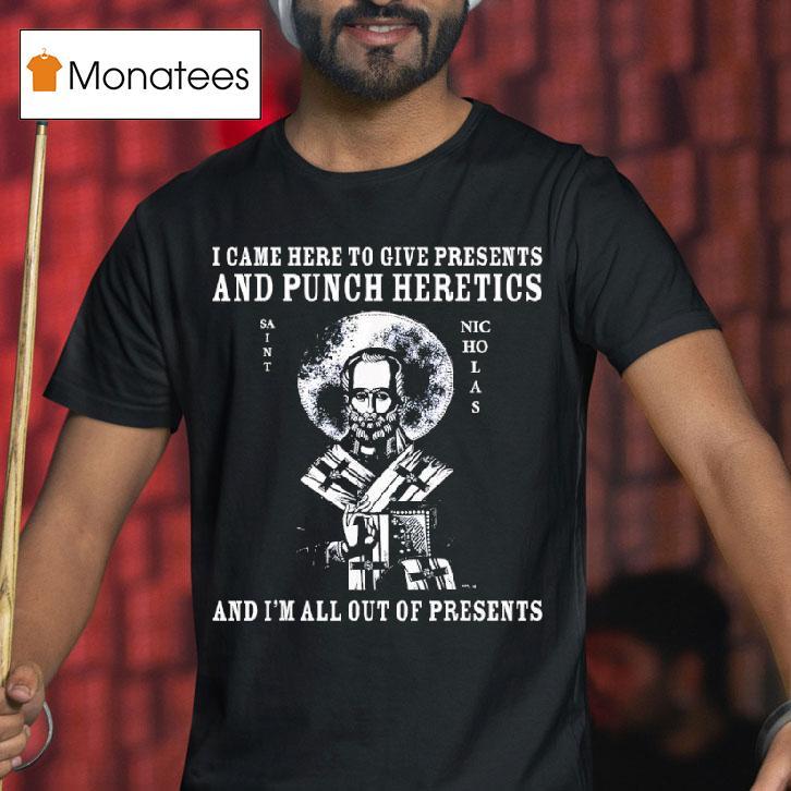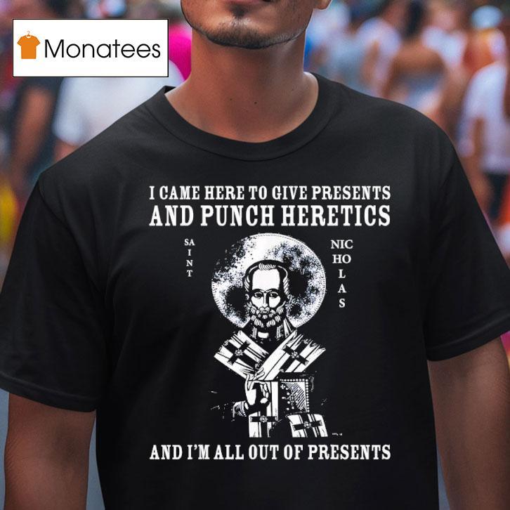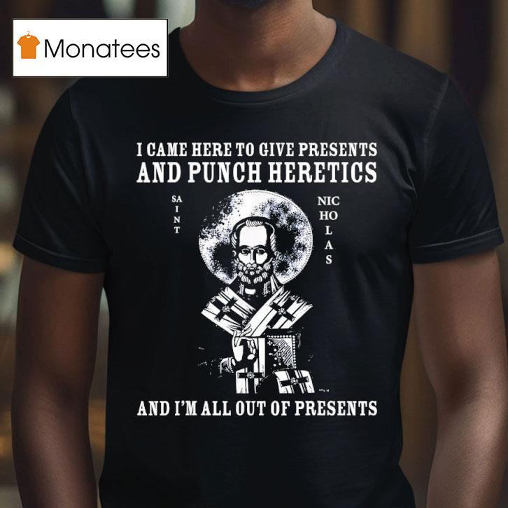 Simple style, big impact with I Came To Give Presents And Punch Heretics St Nicholas Icon Shirt, tis the season for giving, and what better way to spread holiday cheer than with the iconic figure of St. Nicholas? This festive shirt not only pays homage to the gift-giving saint, but also serves as a bold statement against heresy. Get ready to spread joy and punch heretics with style.