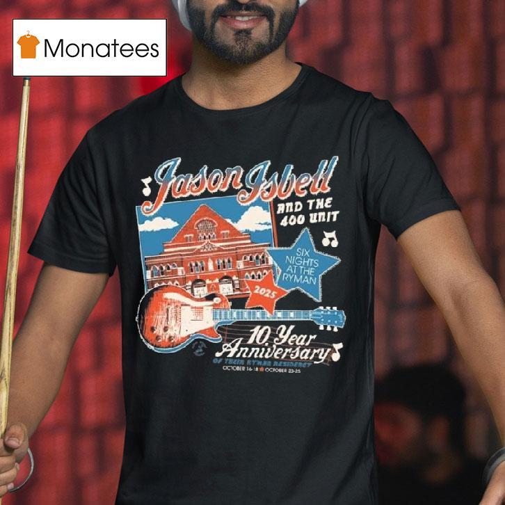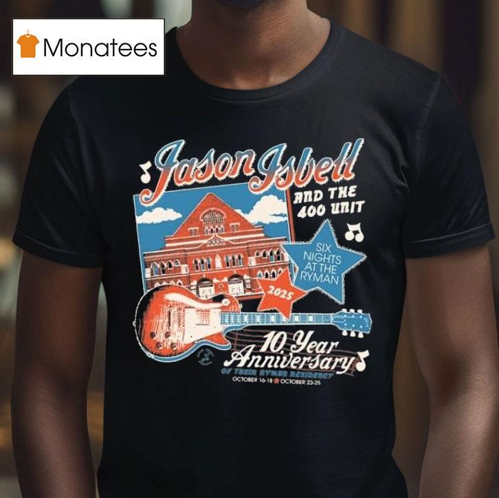 The perfect blank canvas with Jason Isbell And The 400 Unit Six Nights At The Ryman Of Their Ryman Residency October 2025 10 Year Anniversary Guitar Shirt, get ready to experience an unforgettable performance as Jason Isbell and The 400 Unit celebrate the 10-year anniversary of their Ryman Residency with Six Nights at the Ryman in October 2025. Don’t miss your chance to snag the limited edition guitar shirt to commemorate this milestone event.