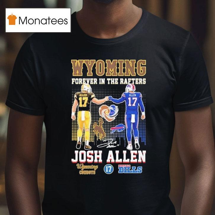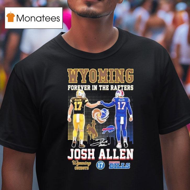 Casual sophistication, always in style with Josh Allen Forever In The Rafters Wyoming Cowboys Buffalo Bills Shirt, josh Allen’s legacy continues to shine as the star quarterback’s jersey is forever immortalized in the rafters at the University of Wyoming and Buffalo Bills stadiums. Fans can now proudly show their support for the talented athlete by donning the official Josh Allen Forever In The Rafters shirt.