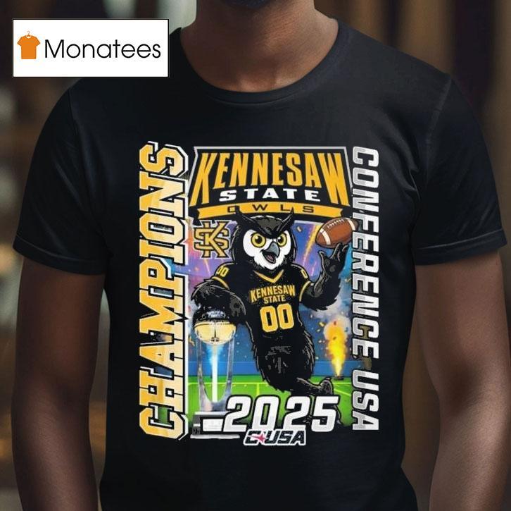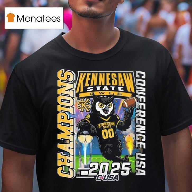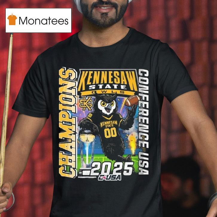 Chic minimalism, always with Kennesaw State Owls Champions Conference Usa 2025 Mascot Shirt, in 2025, the Kennesaw State Owls made history by winning the Conference USA championship title. As fans celebrated their team’s victory, they proudly sported the new conference champions mascot shirt, featuring the iconic owl logo and the bold proclamation of greatness: “Champions 2025.”