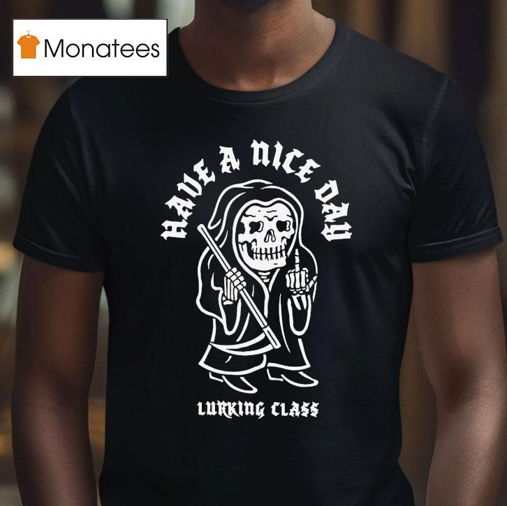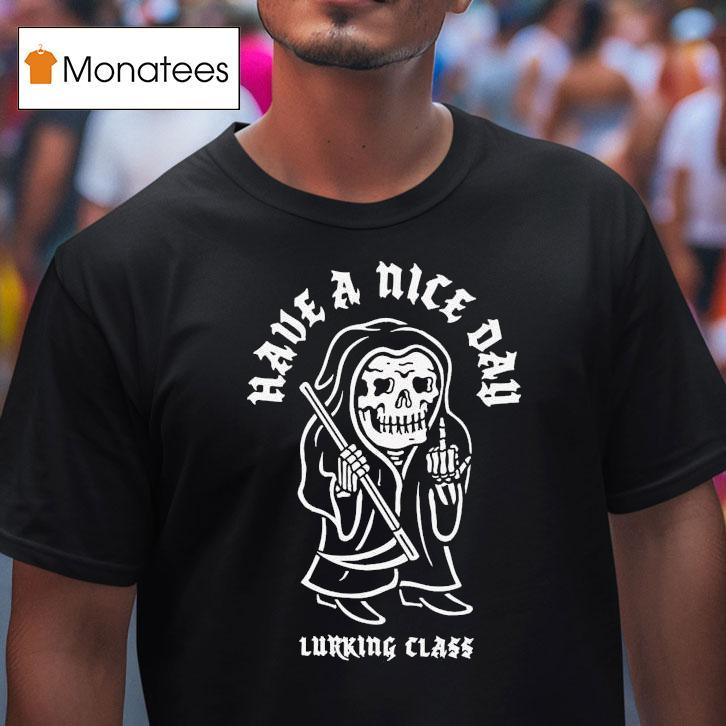 Casual chic, timeless appeal with Lurking Class Greetings Have A Nice Day Middle Finger Grim Reaper Shirt, “Are you tired of boring and generic greetings? Say hello with an edgy twist with the Lurking Class Greetings Have A Nice Day Middle Finger Grim Reaper Shirt. Make a statement and stand out from the crowd with this bold and rebellious design. Embrace your dark side and have a nice day!”