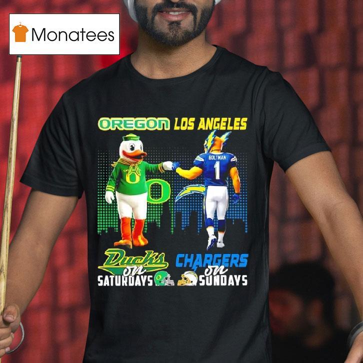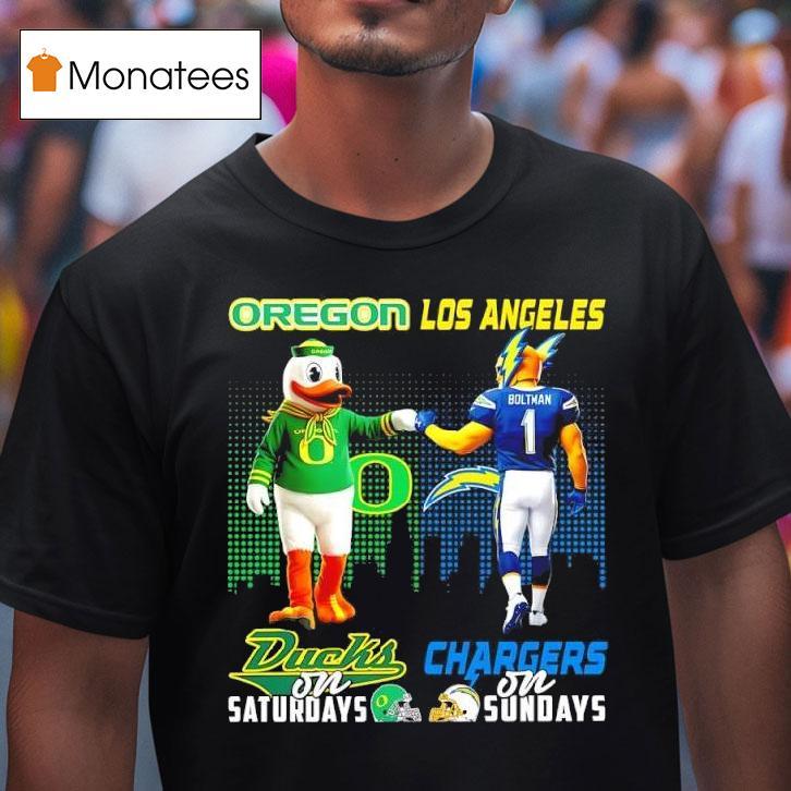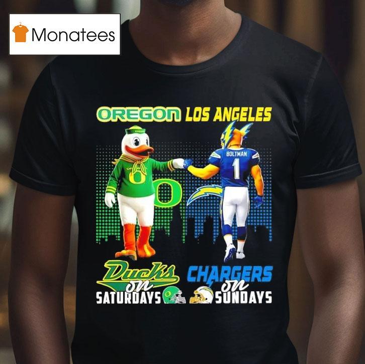 Uncomplicated elegance with Mascot Of Oregon Ducks On Saturdays And Los Angeles Chargers On Sundays Shirt, introducing the ultimate game day attire for fans of the Oregon Ducks and Los Angeles Chargers! Embrace your team spirit with this dual-purpose shirt featuring both mascots. Show your support on Saturdays and Sundays with this must-have shirt for die-hard football fans.
