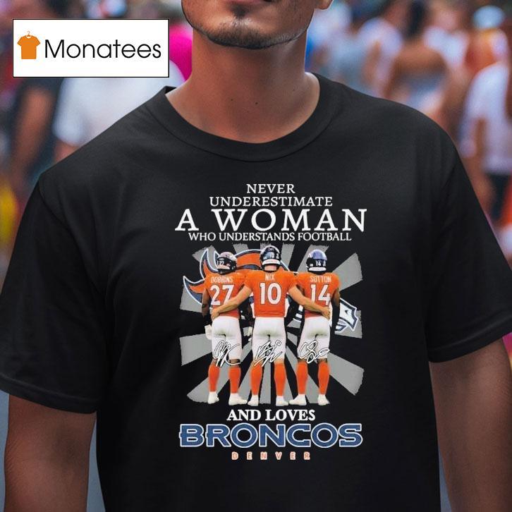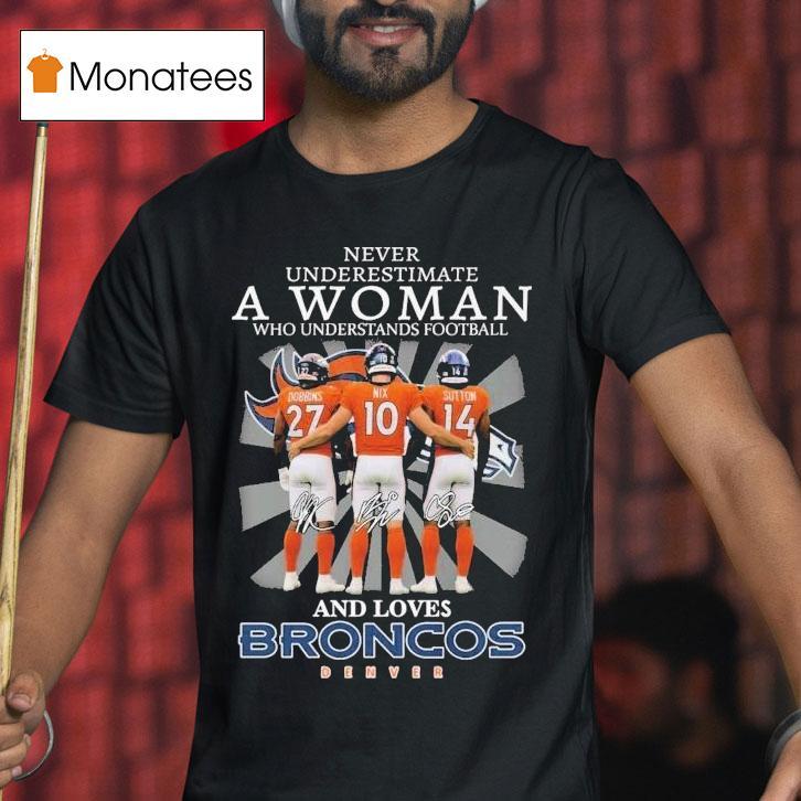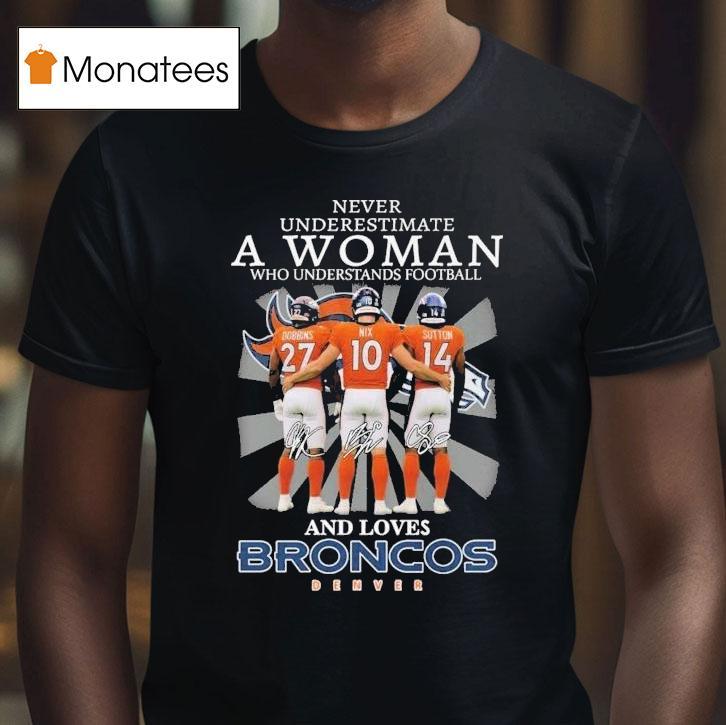 Sleek simplicity, ultimate comfort with Never Underestimate A Woman Who Understands Football And Loves Denver Broncos Signatures Shirt, “Behind every great Denver Broncos fan is a woman who not only understands the game of football, but also proudly wears her team’s signatures on her shirt. Never underestimate the passion and knowledge of a woman who loves her Broncos.”