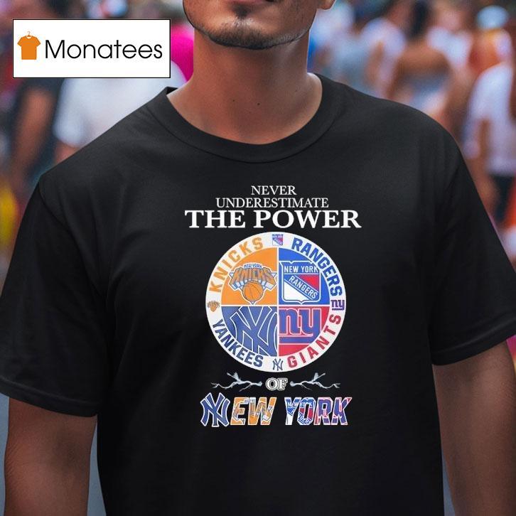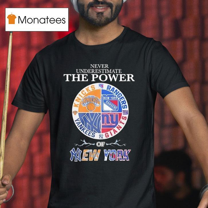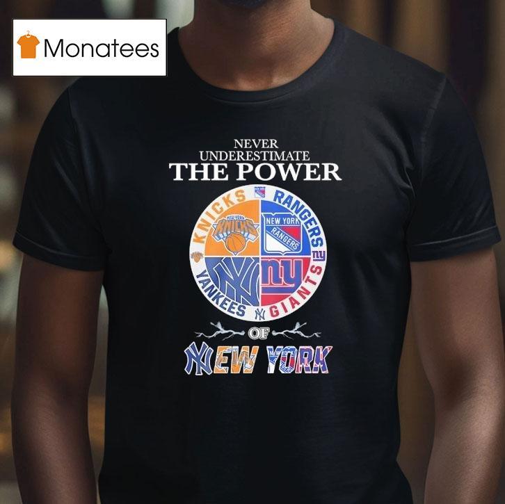 Classic tee, endless possibilities with Never Underestimate The Power Of New York Knicks Rangers Yankees Giants Mashup Logo Shirt, step into the streets of New York City and you’ll quickly realize the city’s love for sports teams. But one logo has taken the city by storm – the New York Knicks Rangers Yankees Giants mashup logo shirt. It’s a true symbol of the city’s undying passion for its beloved teams.