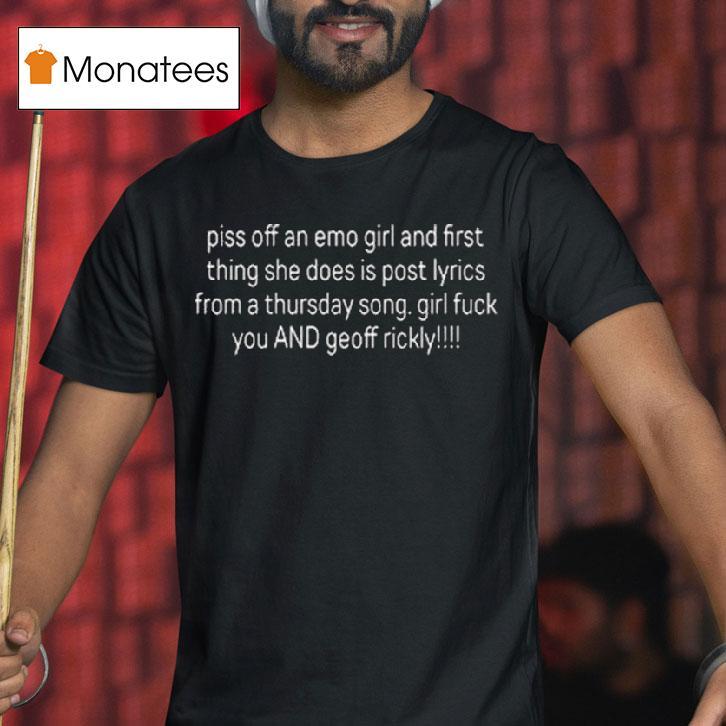 Trendy, timeless tee with Piss Off An Emo Girl And First Thing She Does Is Post Lyrics From A Thursday Song Girl Shirt, “Piss off an emo girl and she’ll make sure you know it, with her favorite Thursday song playing in the background and her iconic band shirt proudly displayed. Don’t mess with her emotions or she’ll wear them on her sleeve, literally.”