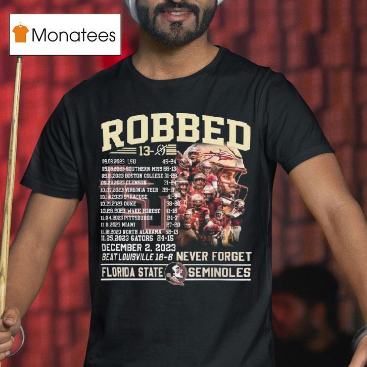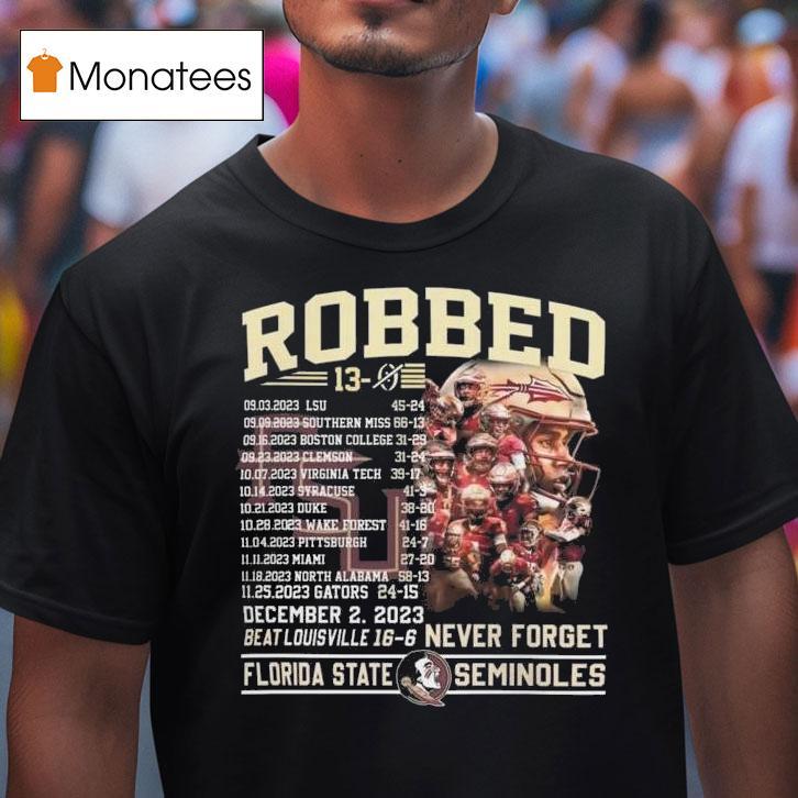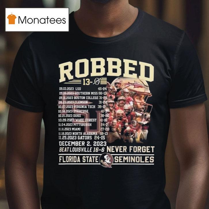 Style that speaks volumes with Robbed Never Forget Florida State Football Undefeated 13-0 Schedule Shirt, in 2013, the Florida State football team was unstoppable, going undefeated with a record of 13-0. Fans proudly wore their commemorative “Never Forget” shirts, celebrating the team’s success. But for one player, the memories of that historic season would be forever tainted by a robbery.