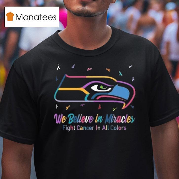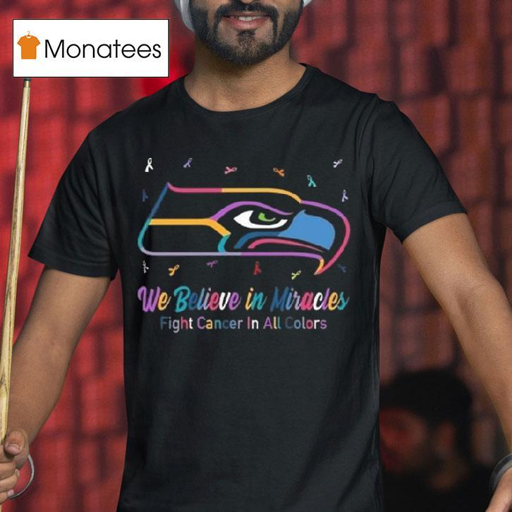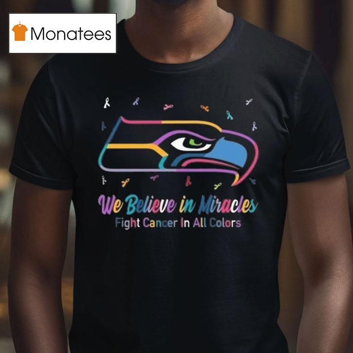 Classic tee, endless possibilities with Seattle Seahawks We Believe In Miracles Fight Cancer In All Colors Shirt, the Seattle Seahawks are known for their passion and determination on the football field, but their commitment to fighting cancer is equally admirable. With the inspirational “We Believe In Miracles Fight Cancer In All Colors” shirt, the team shows their support for those battling this disease.