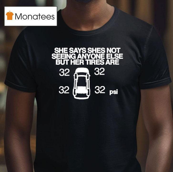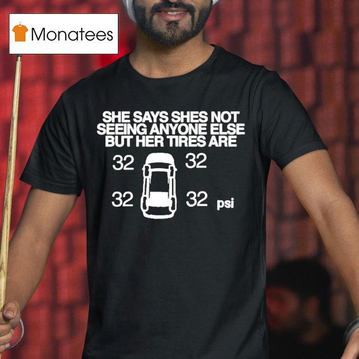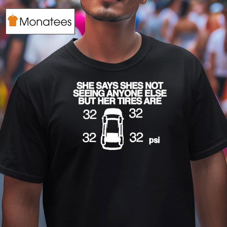 Effortless charm, everyday wear with She Says She Not Seeing Anyone Else But Her Tires Are 32 Psi Shirt, meet Sarah, a woman who claims she’s not seeing anyone else, yet her tires tell a different story. With her “Tires Are 32 Psi” shirt as a constant reminder, Sarah navigates the complexities of modern dating while trying to maintain her independence and honesty.