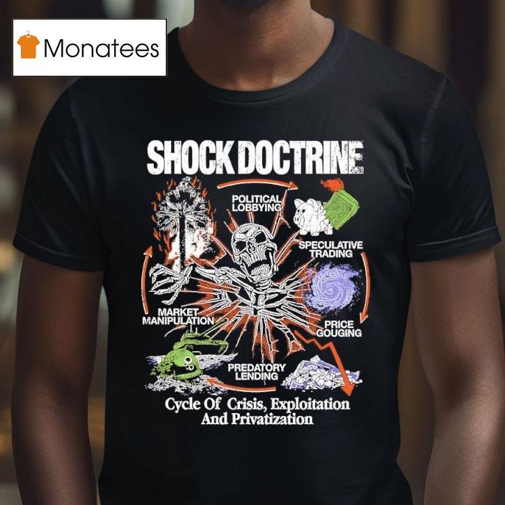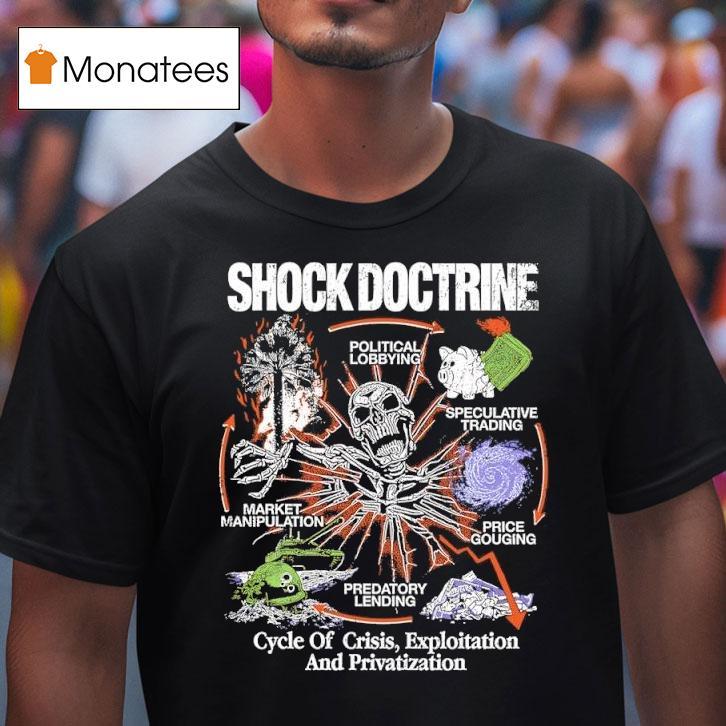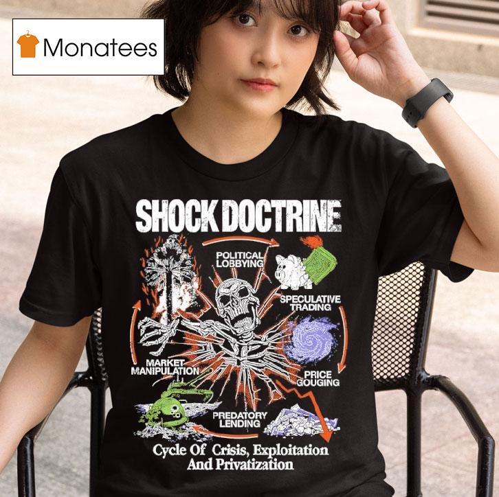 Wardrobe must-have with Shock Doctrine Cycle Of Crisis Exploitation And Privatization Shirt, are you familiar with the Shock Doctrine cycle of crisis exploitation and privatization? This controversial concept is the inspiration behind our new shirt design. Join the conversation and make a statement about this economic phenomenon with our eye-catching t-shirt.