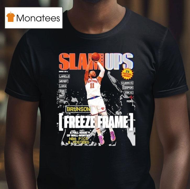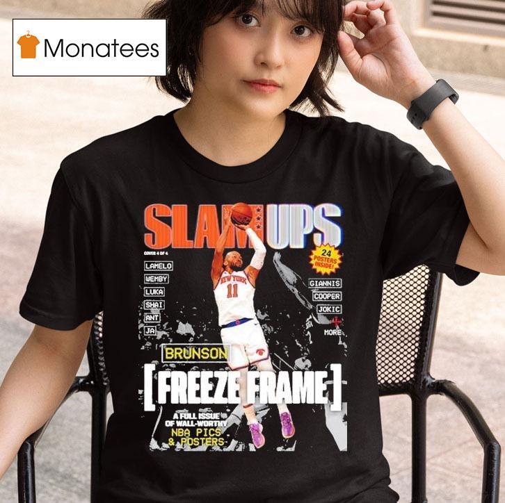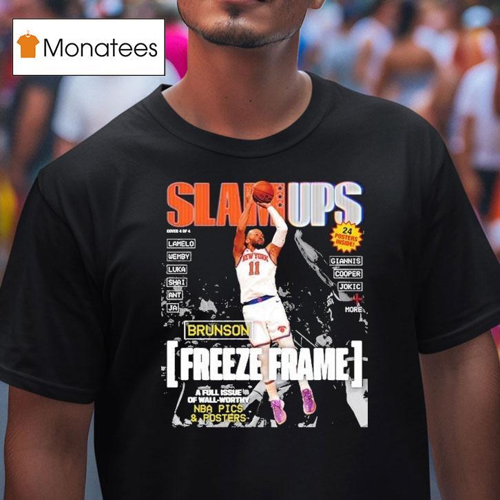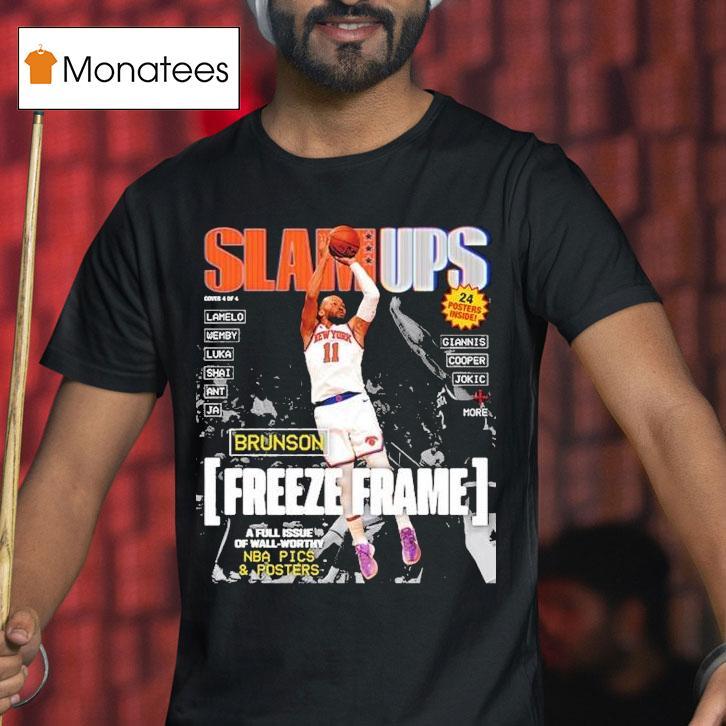 Classic look, contemporary feel with Slam Ups Jalen Brunson Freeze Frame Shirt, bring your street style to the court with Slam Ups’ Jalen Brunson Freeze Frame Shirt. This stylish tee features a bold freeze frame graphic of the Dallas Mavericks point guard, making it the perfect addition to any fan’s wardrobe. Get ready to turn heads both on and off the court.