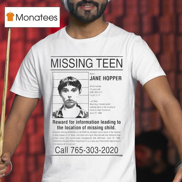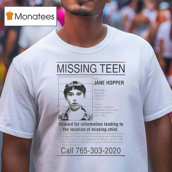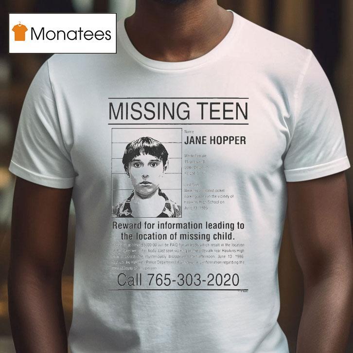 Casual sophistication, always in style with Stranger Things Missing N Jane Hopper Reward For Information Leading To The Location Of Missing Child Shirt, welcome to the mysterious world of Hawkins, where nothing is as it seems. A new case rocks the town as young Jane “Eleven” Hopper goes missing. Desperate for answers, her loved ones offer a sizeable reward for any information on her whereabouts. Could this be the beginning of another Stranger Things adventure?