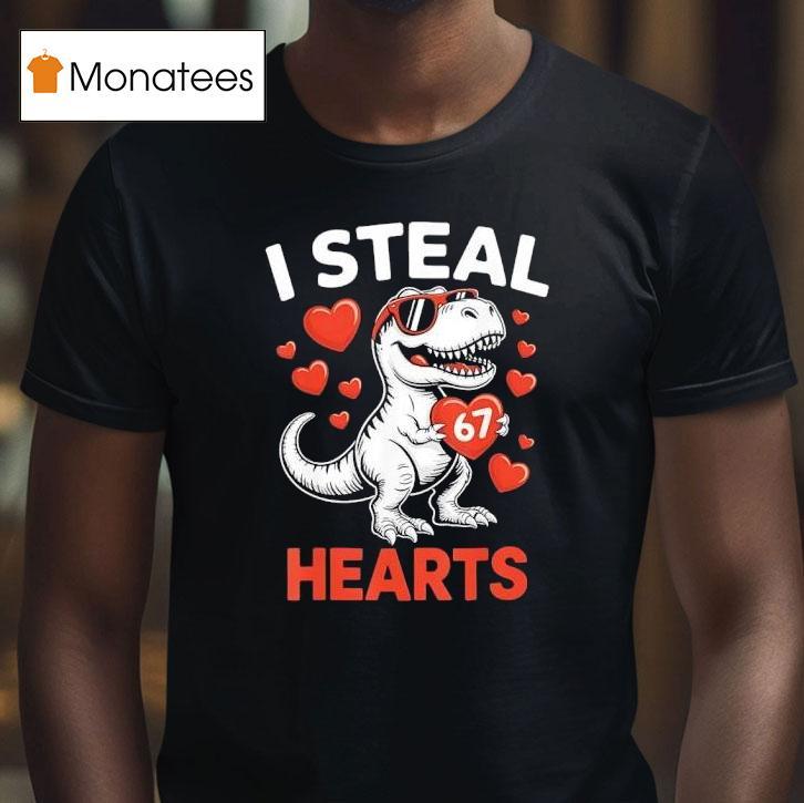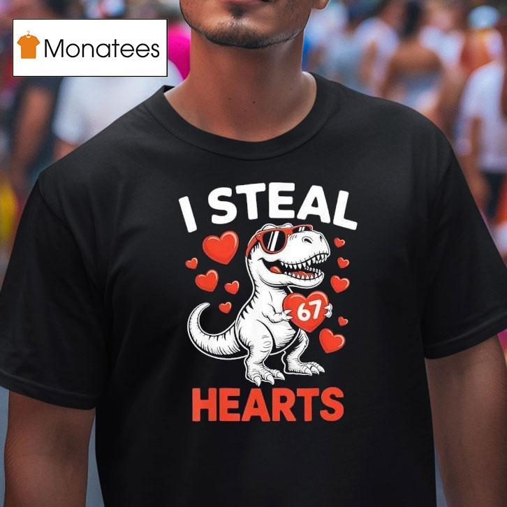 Your style, your signature with T-rex Holding Heart 6 7 I Steal 67 Hearts Valentine’s Day Meme Shirt, get ready to steal some hearts this Valentine’s Day with the ultimate T-rex meme shirt! Featuring a fierce T-rex holding a heart with the text “I steal 67 hearts” this shirt is sure to make a statement and win over your crush. Don’t miss out on this unique and fun design!