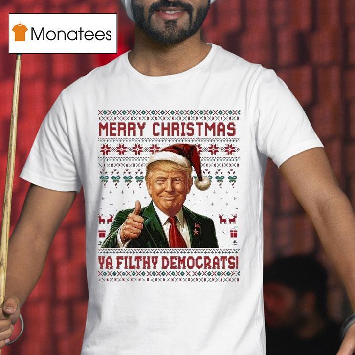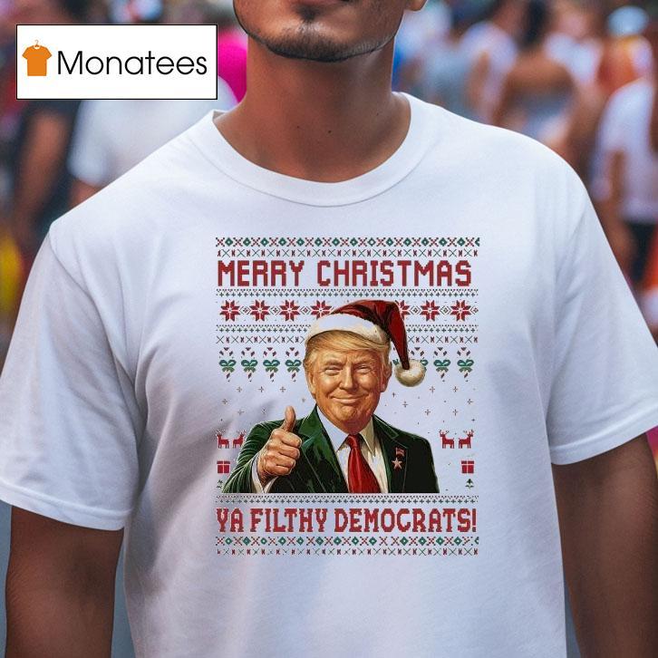 Style that suits you with Trump Merry Christmas Ya Filthy Democrats! Shirt, get ready to spread some holiday cheer and make a bold political statement with the Trump Merry Christmas Ya Filthy Democrats! Shirt. Perfect for those who want to show their support for the president and celebrate the season at the same time.