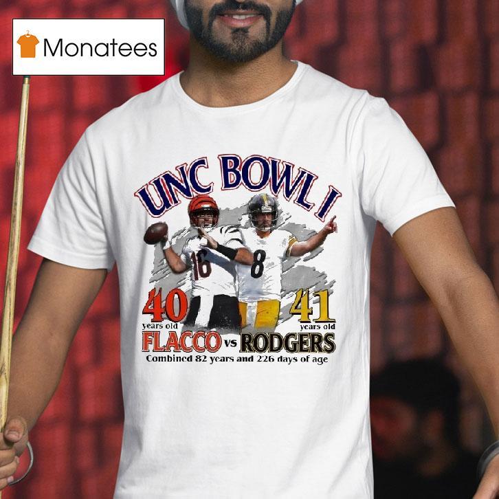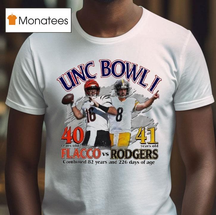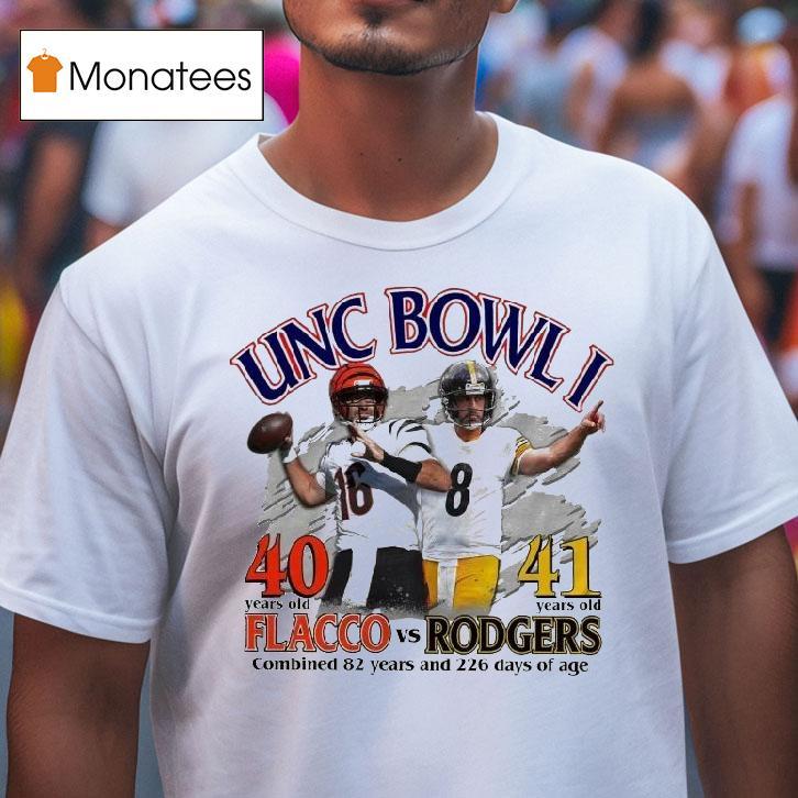 Elevate your casual look with Unc Bowl 40 Years Old Flacco X 41 Years Old Rodgers Shirt, it’s been four decades since the unforgettable Unc Bowl, and the legendary quarterbacks Joe Flacco and Aaron Rodgers are still making waves in the NFL. As they both approach their 40s, celebrate their lasting impact with the new 41 Years Old Rodgers and Flacco Unc Bowl shirt.