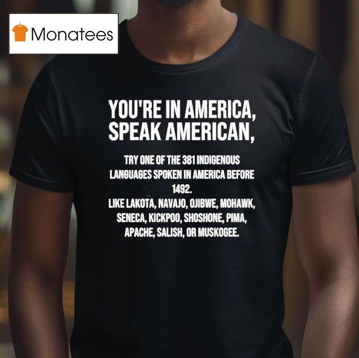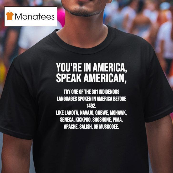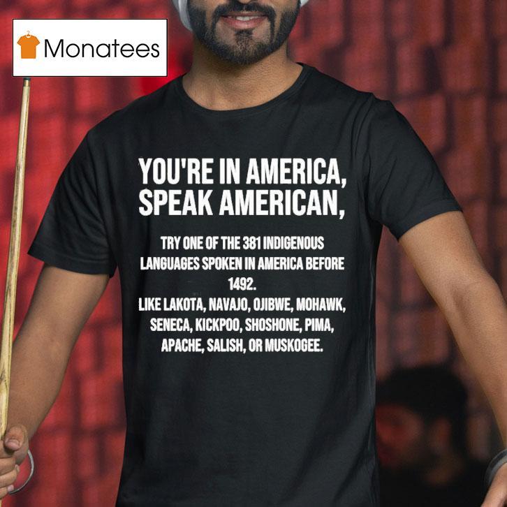Classic look, contemporary feel with You’re In America Speak American Try One Of The 381 Indigenous Languages Spoken In America Before 1492 Shirt, america is known as the melting pot of cultures, but it is often forgotten that there were hundreds of indigenous languages spoken here before 1492. Embrace the diversity and celebrate the rich history of this land with the unique and thought-provoking “You’re In America Speak American” shirt, featuring one of the 381 indigenous languages.